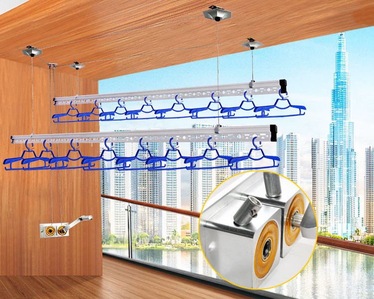 Bạn không phải lo lắng về việc thanh phơi bị trượt hay rung lắc khi gió to. Cáp lụa inox 304 có độ bền cao và không bị oxy hóa. Hệ thống vòng bi hãm tự động giúp thanh phơi luôn ở vị trí mong muốn, không bị tự động hạ xuống hay nâng lên.